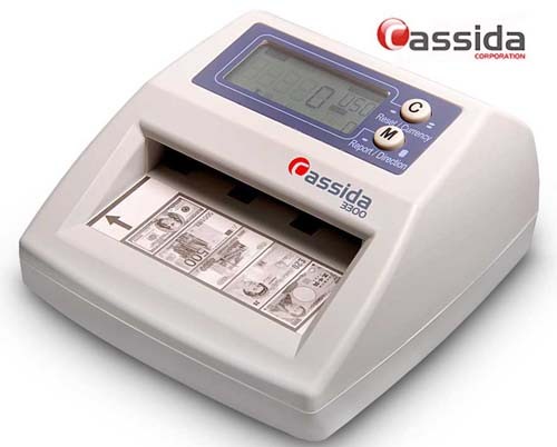 Простота эксплуатации При проверке подлинной банкноты на экране отображается ее номинал. Если банкнота сомнительная, она не проходит сквозь детектор, при этом на экране высвечиваются ошибки. После завершения работы с определенным типом валют можно просмотреть количество проверенных купюр по номиналу и итоговую сумму. Очевидное преимущество Cassida 3300 – компактный размер и небольшой вес.