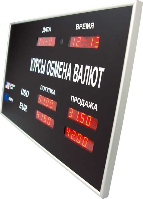 Корпус табло изготавливается из легкого алюминиевого профиля и прочного оргстекла. Базовые модели табло котировки валют имеют: